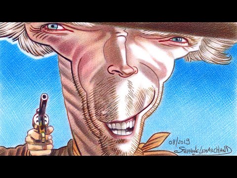 Les couleurs choisies par l’artiste pour réaliser cette caricature rappellent la terre aride des grandes plaines, le bois brut des chariots des pionniers, la poussière soulevée par les sabots des chevaux, la roche rosie par le soleil couchant. Elles sont en accord avec la passion de l’acteur Clint Eastwood pour le Western.