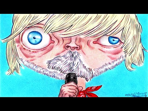 Cette caricature a été postée sur la chaîne YouTube du dessinateur Stéphane Lemarchand. « C’est pas l’homme qui prend la mer… » chante-t-il en s’accompagnant à la guitare. Et la moustache de Renaud lui répond par un « tatatin ». Elle frémit subtilement mais avec enthousiasme. Le caricaturiste a revêtu lui-même un blouson noir et une cravate bordeaux pour l’occasion : un discret rappel vestimentaire du rockeur…
